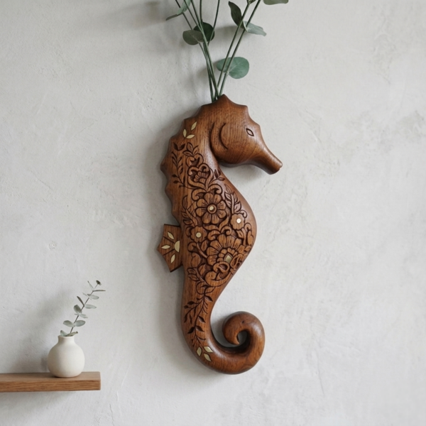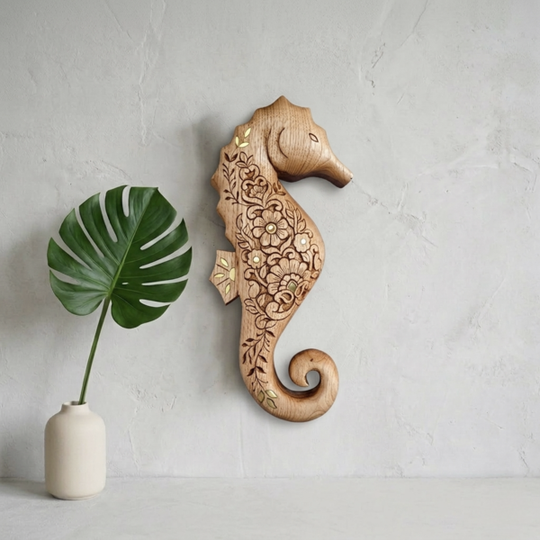This beautifully detailed seahorse wall piece is hand carved from solid wood and finished with delicate brass inlays. Symbolizing patience, protection, and gentle strength, the seahorse brings a calm ocean-inspired presence to your space.
