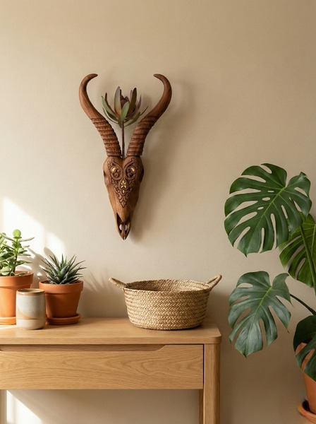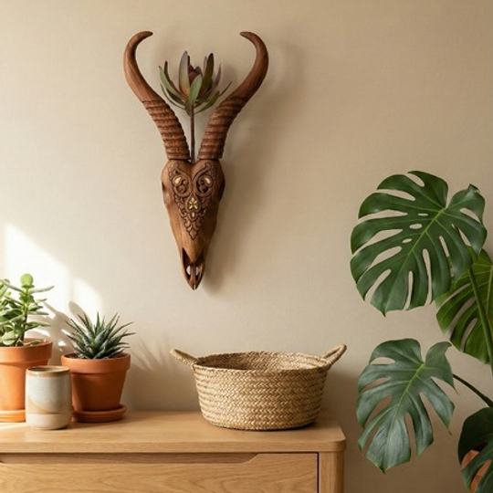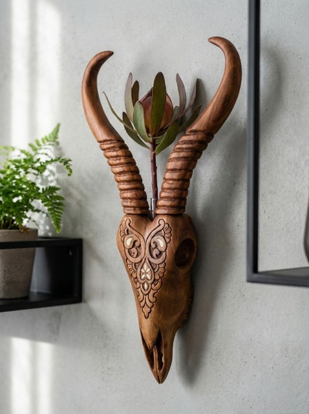 A fusion of sculptural art and functional decor. This handcrafted wooden wall vase mimics the form of a Springbok skull, featuring detailed decorative carvings and elegant brass inlays.