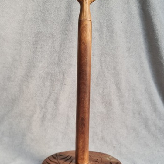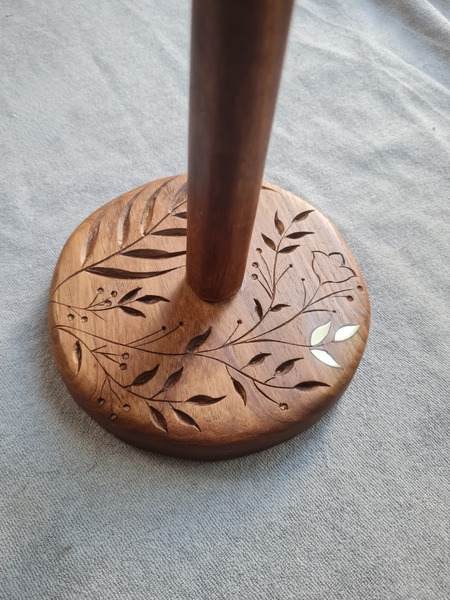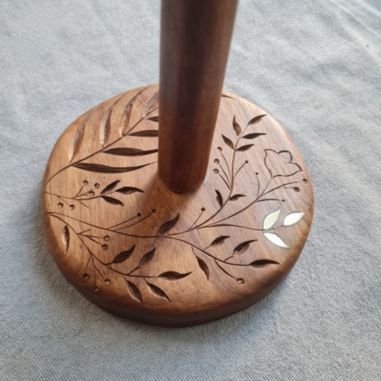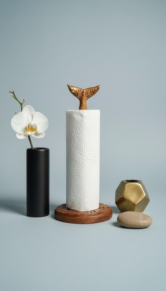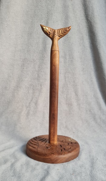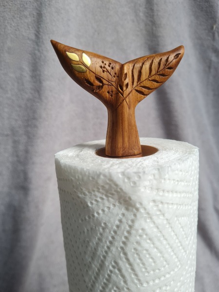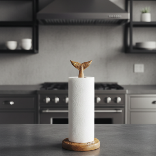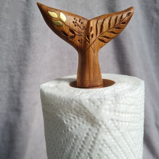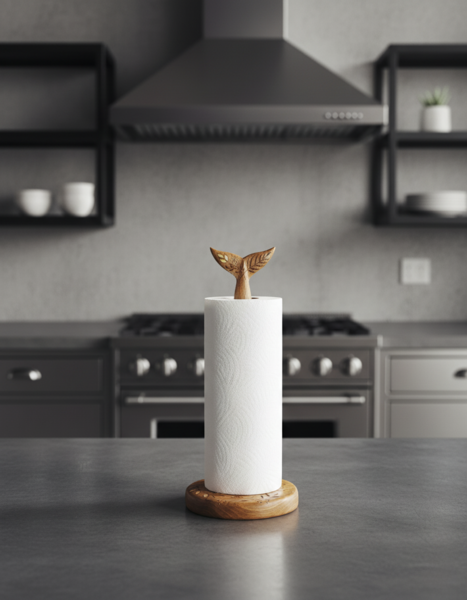 Bring a touch of nature and artisanal craftsmanship to your kitchen or dining space with this beautifully hand-carved wooden paper towel holder. Inspired by the grace of the ocean, the top features a stunning whale tail design, intricately detailed with carved leaf motifs and delicate brass inlays that add a subtle sparkle.